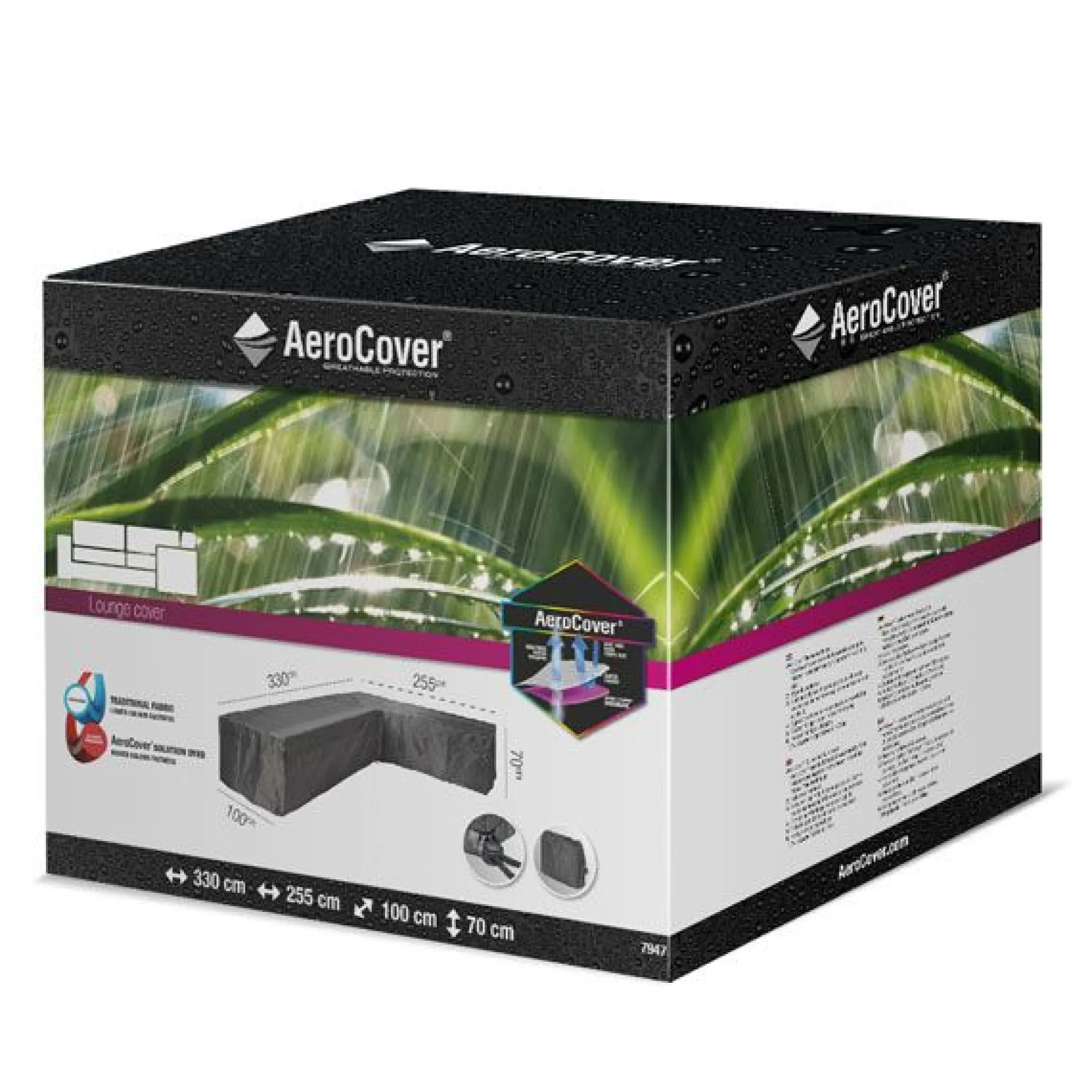 Loungesethoes voor hoeksets van AeroCover. Ademende loungesethoes voor loungeset rechts in L-vorm 330x255x100xh70cm.