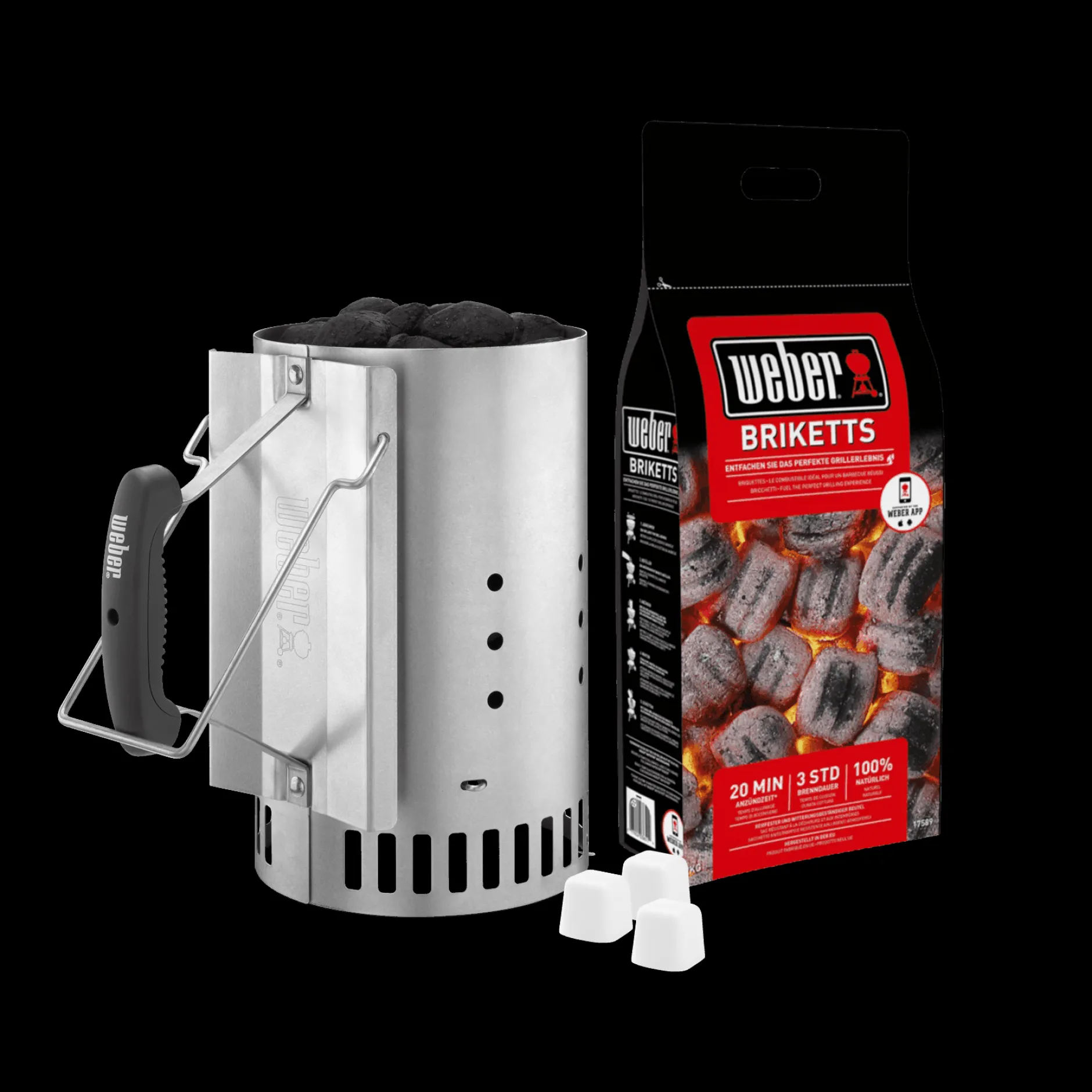 Deze set bevat een starterschouw, 3 aanmaakblokjes en een zak briketten van 2kg.