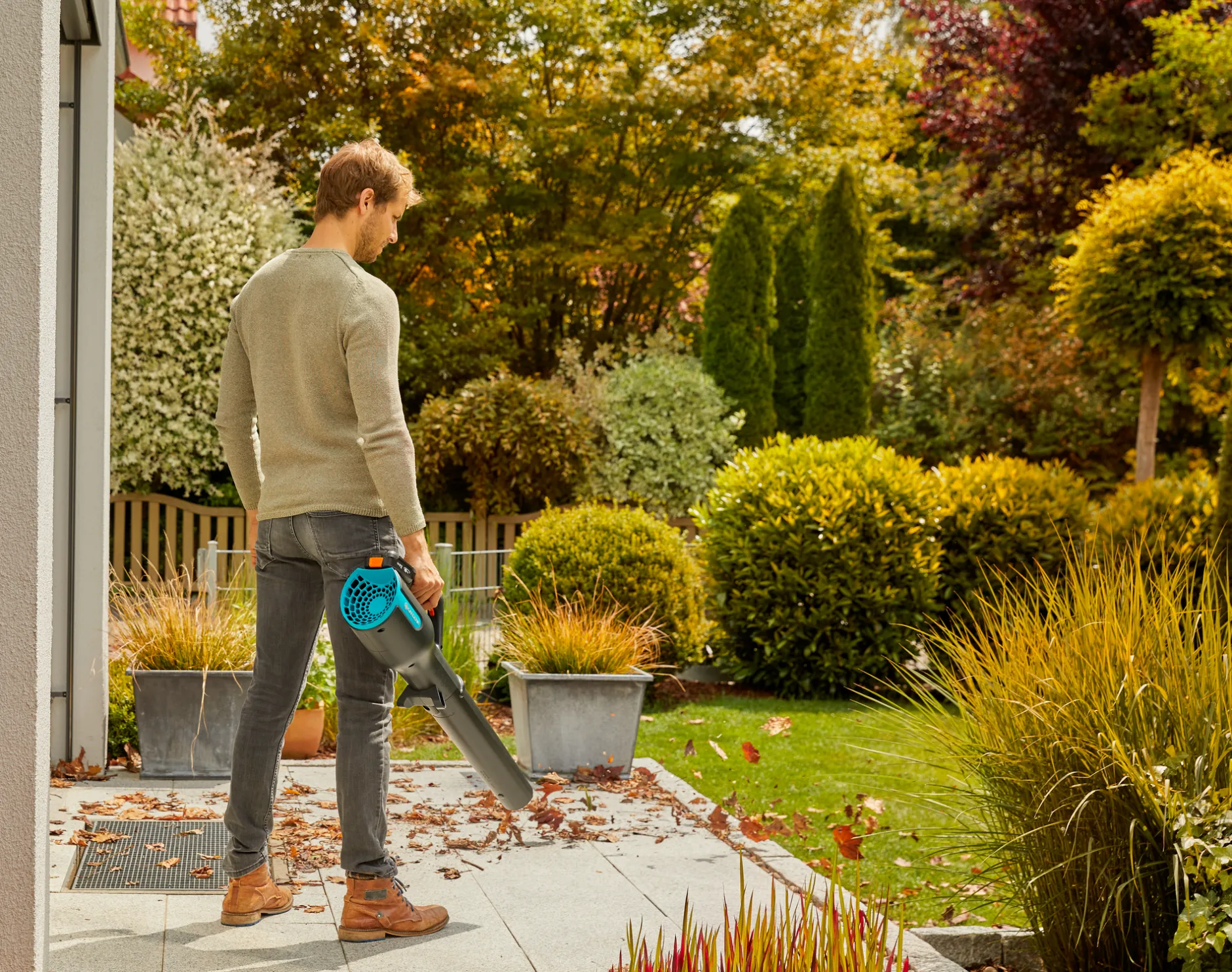 De PowerJet 18V P4A kant-en-klare set van GARDENA is een accu-aangedreven bladblazer waarmee u de tuin flexibel, snel en effectief kunt opruimen. Dit veelzijdige product is ideaal voor gebruik in de tuin en rondom het huis. De bladblazer maakt niet alleen indruk met zijn slimme en functionele ontwerp, maar vooral met zijn opmerkelijk krachtige blaasprestaties. Of het nu gaat om bladeren, kleinere takken of gemaaid gras, de PowerJet blaast ze snel, krachtig en efficiënt weg. Dankzij het innovatieve ontwerp en het hoge luchtdebiet ziet uw tuin er in een mum van tijd verzorgd en opgeruimd uit. De blazer maakt indruk met een maximaal luchtvolume van 7,9 kubieke meter per minuut voor geweldige blaasprestaties en stelt u in staat een gebied tot 400 vierkante meter schoon te maken. Afhankelijk van gebruik en tuintoepassing kan het toerental van de bladblazer individueel worden aangepast. Dankzij het lage gewicht is het werken met de bladblazer uiterst comfortabel en gemakkelijk, zelfs over de volledige maximale looptijd van 13 tot 23 minuten, afhankelijk van het ingestelde vermogen. De blazer is ook zo goed uitgebalanceerd dat er geen vermoeidheid is in de polsen en armen. Dit wordt nog versterkt door de uitstekende ergonomie van het product. Een duidelijk zichtbare LED-display op het apparaat toont het huidige laadniveau van de accu. Deze set biedt u nog meer: de set bevat ook nog een extra, bevestigbaar precisiemondstuk. Dit mondstuk vergroot het bereik van de bladblazer, waardoor u nog preciezer kunt werken in die lastig te bereiken hoeken in uw tuin en biedt meer flexibiliteit bij het aanbrengen. De krachtige, compacte en handige GARDENA accu-bladblazer is daarom ideaal voor een breed scala aan schoonmaakklussen.